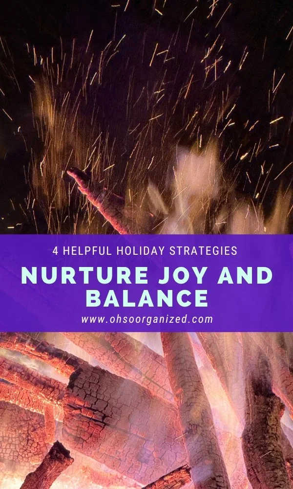 Are your holidays infused with joy, anxiety, or both? How would you like them to be? Is the balance and focus off? Which strategies resonate most with you? What brings you joy and balance?