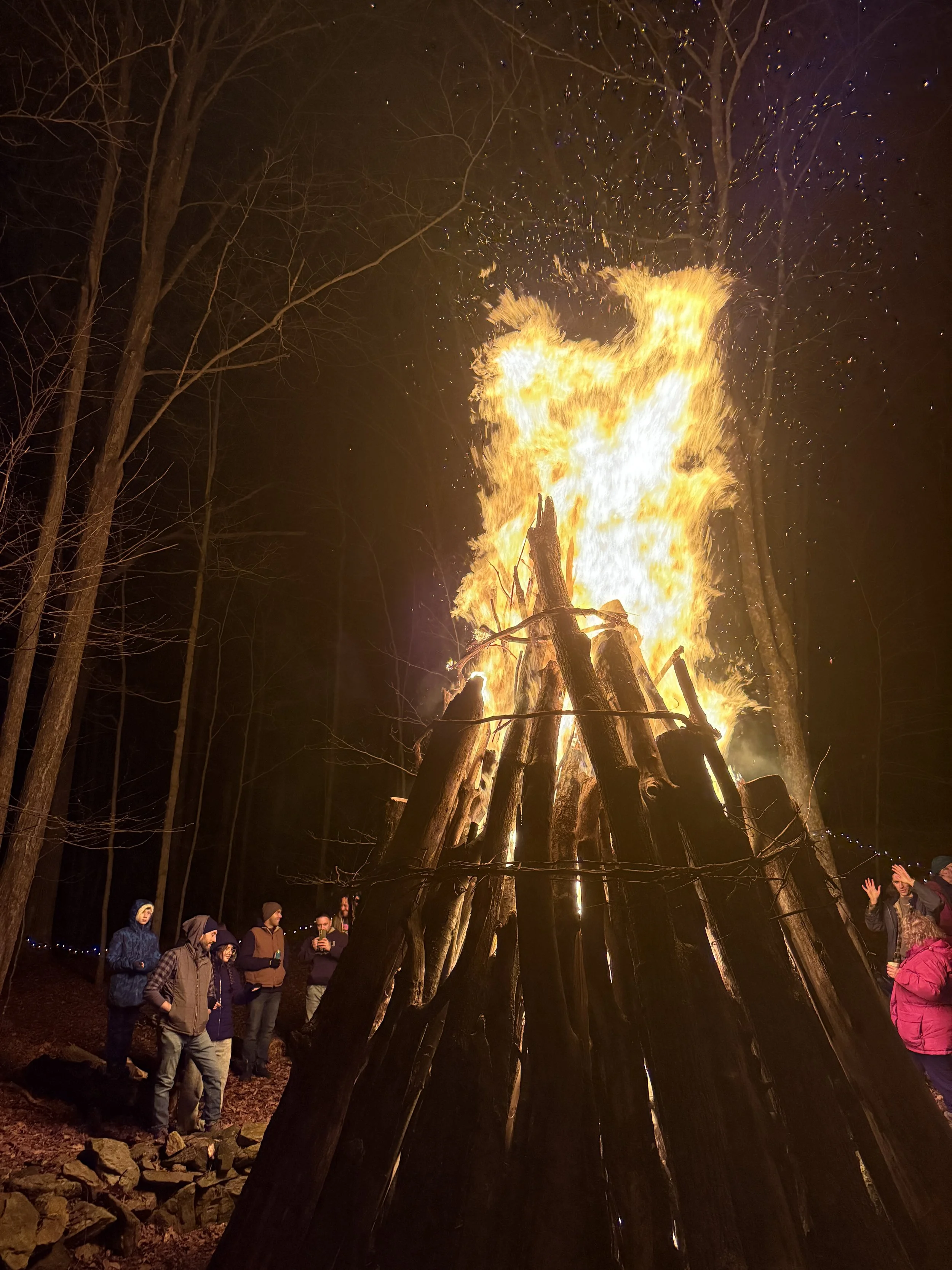 For 32 years, our friends have invited family and friends to join this magical experience. At night, each person carries a lit candle up the hill into the woods, where a tepee-like structure of wooden sticks stands tall in the darkness. Before the bonfire is lit, we are encouraged to reflect on what was, release what we no longer want, and imagine how we wish the new year to be. The structure is lit and begins to burn slowly.