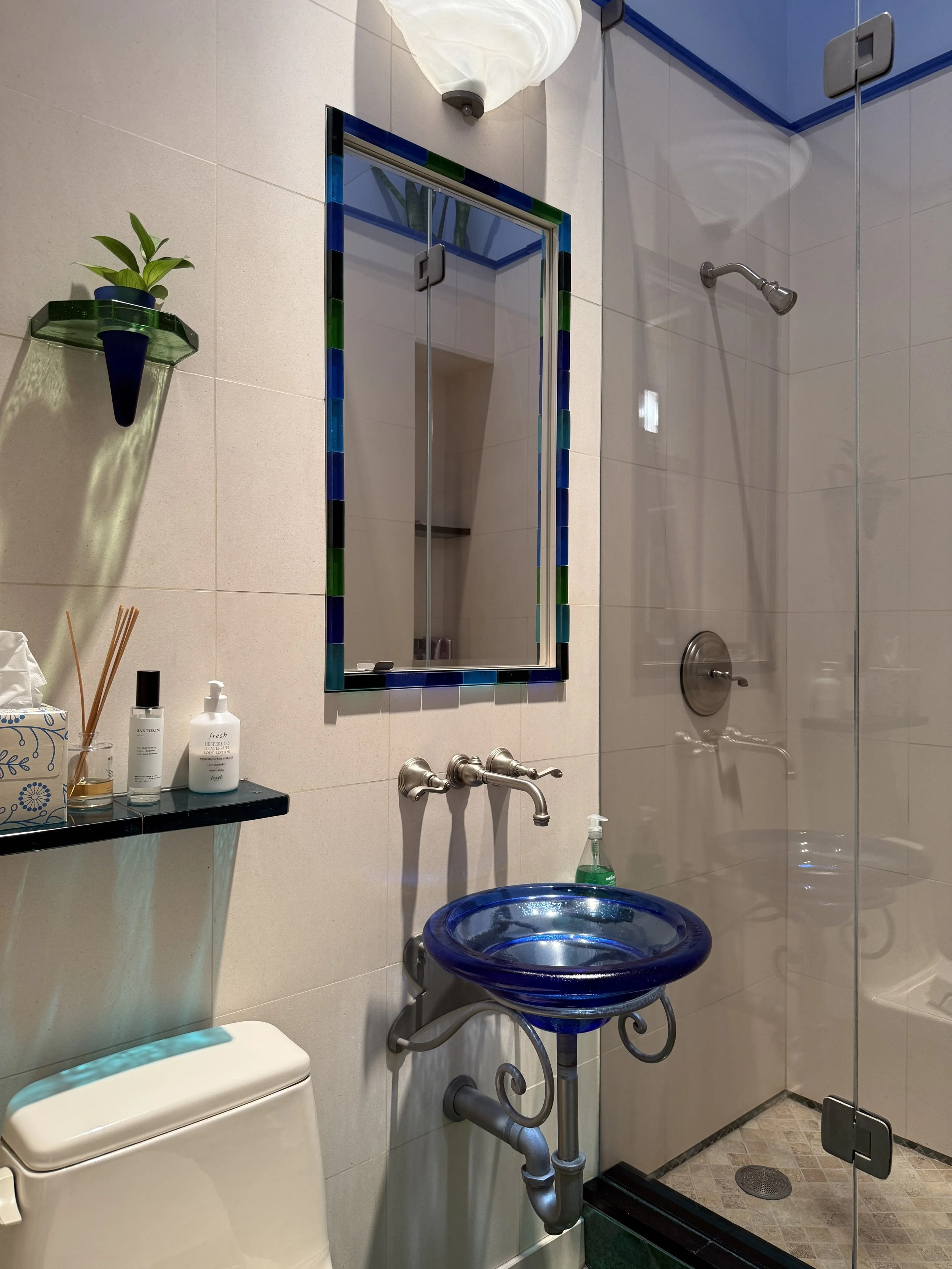 • See: Name three things you see, like a blue glass sink, a green plant, or a white wall lamp.